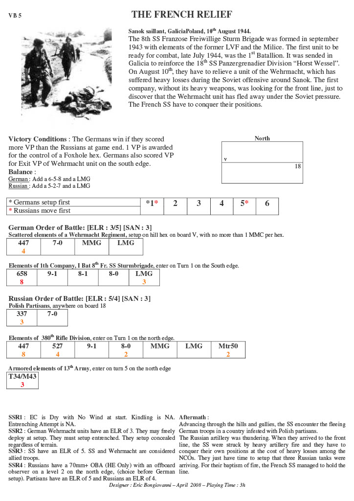 The 8th SS Franzose Freiwillige Sturm Brigade was formed in September 1943 with elements of the former LVF and the Milice. The first unit to be ready for combat, late July 1944, was the 1st Batallion. It was sent into Galicia to reinforce the 18th SS Panzergrenadier Division “Horst Wessel”. On August 10th, they had to relieve a unit of the Wehrmacht, which has suffered heavy losses during the Soviet offensive around Sanok. The first company, without its heavy weapons, was looking for the front line, just to discover that the Wehrmacht unit had fled away under the Soviet pressure. The French SS had to conquer their positions. . .Attacker: Russian / Partisan (380th Rifle Division and armored elements of 13th Army / Polish Partisans)