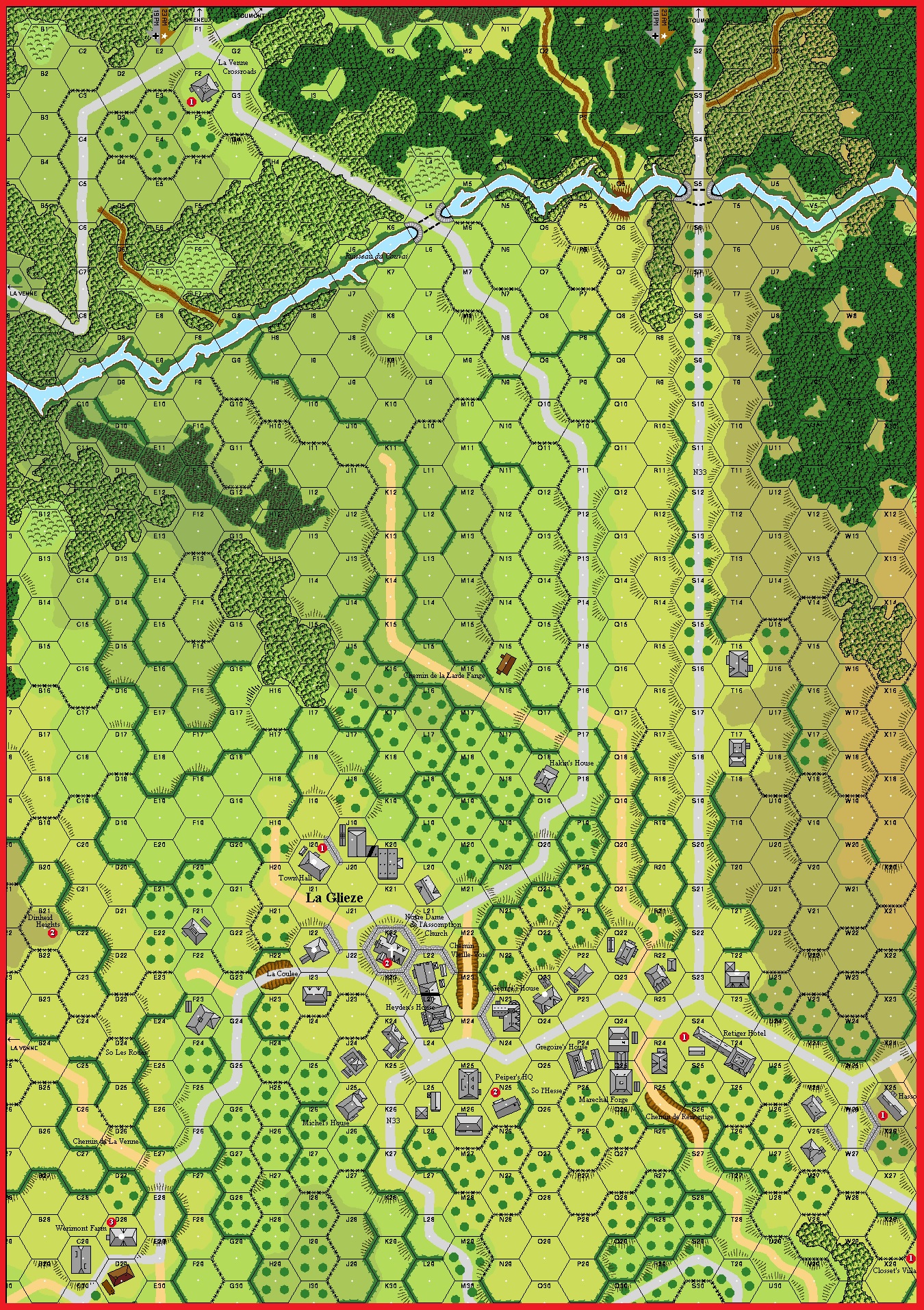 The historic battle of Bastogne lasted from mid-December 1944 to mid-January 1945. American forces formed a perimeter completely around the town with an infantry line several miles outside the town proper. Elements of eight German divisions surrounded Bastogne for several weeks, trying unsuccessfully to capture it with attacks from various directions around the circle. January 3rd was one of the few times during the siege of Bastogne in which the Germans struck parts of the perimeter simultaneously. While elements of the 12.SS-Panzer-Division struck the northeast perimeter in the 501 PIR sector, the 19.SS-Panzer-Grenadier-Regiment of the 9.SS-Division was attacking the northwest perimeter, between Monaville and Longchamps.Attacker: German (SS) (SS Panzergrenadier Regiment 19, 9th SS Panzer Division "Hohenstaufen")