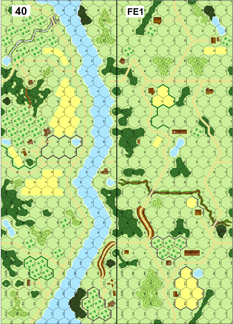 | Misc Rules: | PTO, LJ (Exc: roads exist unpaved). All buildings wooden, no hills exist. A: guns enter towed |