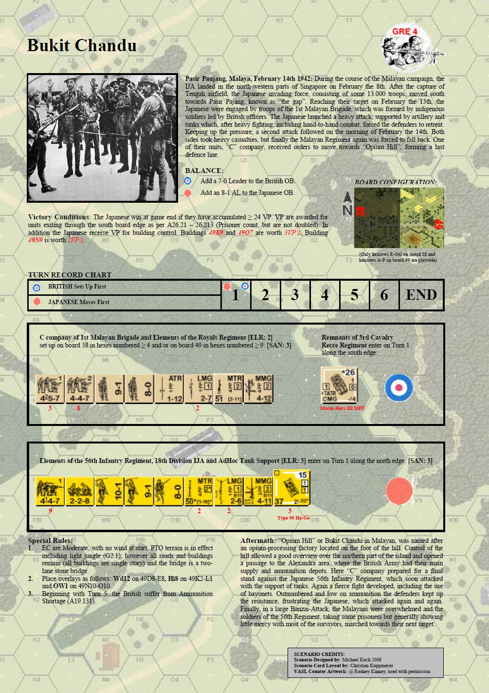 | Misc Rules: | PTO, LJ (Exc: roads / buildings remain). D: Turn 5, the British suffer from Ammo Shortage (A19.131) |