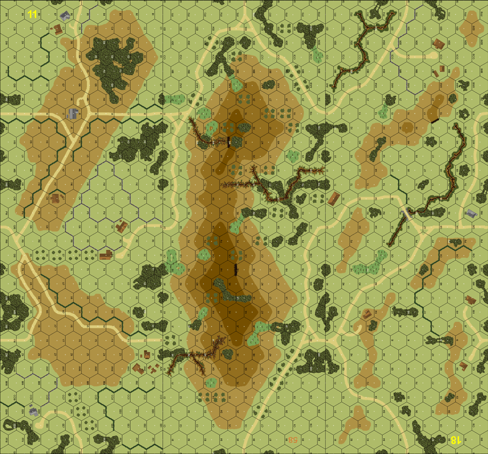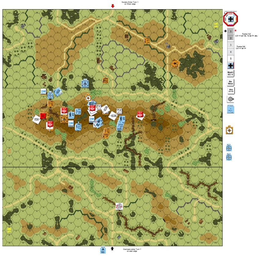 I got the Germans in this East Front meeting engagement. I sent the StuGs around the Soviet right flank to (hopefully) get side/rear shots on Jim's T-34s and ISUs. My main force went straight for the larger, southern hill. I planned to hold its 19 Level 3 hexes and concede to Jim the 6 Level 3 hexes of the northern hill. My plan worked but it was a very close game! Jim: No tactical cleverness helps here. You have to take hilltop hexes. I drove for both hilltops while the 76L ART and LMOR hit the Germans who got there first. My infantry used the cover of the gullies to get up the hills, but Vic's back slope defense was very tough. This became a close-range brawl in which PFs, a PSK, two MMGs and a 9-2 armor leader on the big hill gave Vic a decisive edge. As expected, the Panthers ruled the big hill. Good game, final VP tally: Germans 19, Russians 12. Give the Soviets the balance.