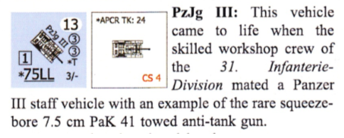 In early March 1943 the German Fourth and Ninth Armies initiated the evacuation of their defenses along the Rzhev-Vyazma salient to the considerably shorter Büffel-Stellung. The delicately timed retrograde operation was masterfully executed. Even though the Germans had reached the relative safety of the Büffel-Stellung, STAVKA ordered an attack. Manning the German defenses in Kurkino, north of Spas-Demensk, was a Probation Battalion. Supporting these reluctant warriors was a company of tank destroyers, including a curious field-conversion: a Panzer III-based self-propelled 7.5cm PaK 41 AT gun.Attacker: Russian (139th Rifle Division, 50th Army and 23rd Guards Tank Brigade)