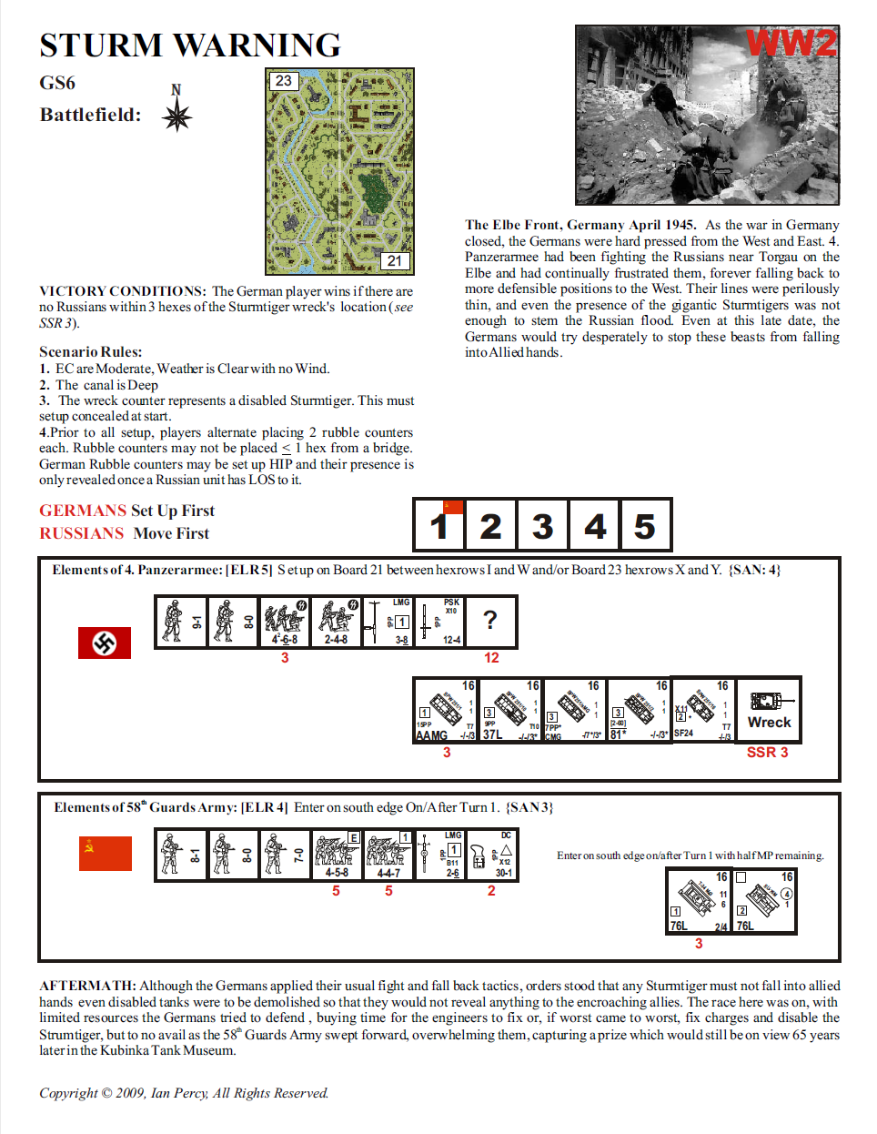 | Misc Rules: | Canal is Deep. D: Wreck counter represents a disabled Sturmtiger (may not fire or move). |