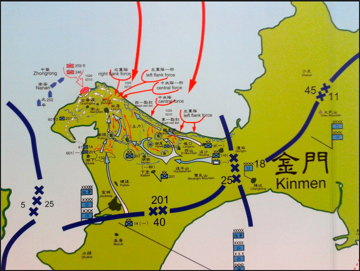 Following the establishment of the People's Republic of China on October 1, 1949, the government of the Republic of China under Chiang Kai-shek began withdrawing its forces from mainland China to Taiwan. However, ROC garrisons remained stationed on the islands of Kinmen and Matsu, located off the coast in Fujian Province. Commanders of the PRC People's Liberation Army (PLA) believed that Kinmen and Matsu had to be taken before a final assault on Taiwan. The PLA planned to attack Kinmen by launching a first attack with 9,000 troops to establish a beachhead, before landing a second force of roughly 10,000 on Greater Kinmen Island, expecting to take the entire island in three days from an ROC garrison not expected to be larger than two divisions. The Communists had incorrectly estimated that there were only 12,000 Nationalist soldiers on the entire island – a calculation that would contribute to their calamitous defeat. Expecting that a PLA attack was imminent, ROC commanders ordered the immediate construction of fortifications. By October, ROC troops had laid 7,455 land mines, and constructed roughly 200 earthen bunkers on the shores of Kinmen, as well as several anti-amphibious landing beach obstacles. The ROC garrison on Kinmen was also reinforced with more armor, troops and supplies. In the opening hours of October 25, the PLA's armada (consisting of hundreds of wooden fishing boats) set sail for Kinmen.Attacker: Red Chinese (Elements of the 244th, 251st and 253rd Regiments, 28th Division, People's Liberation Army)