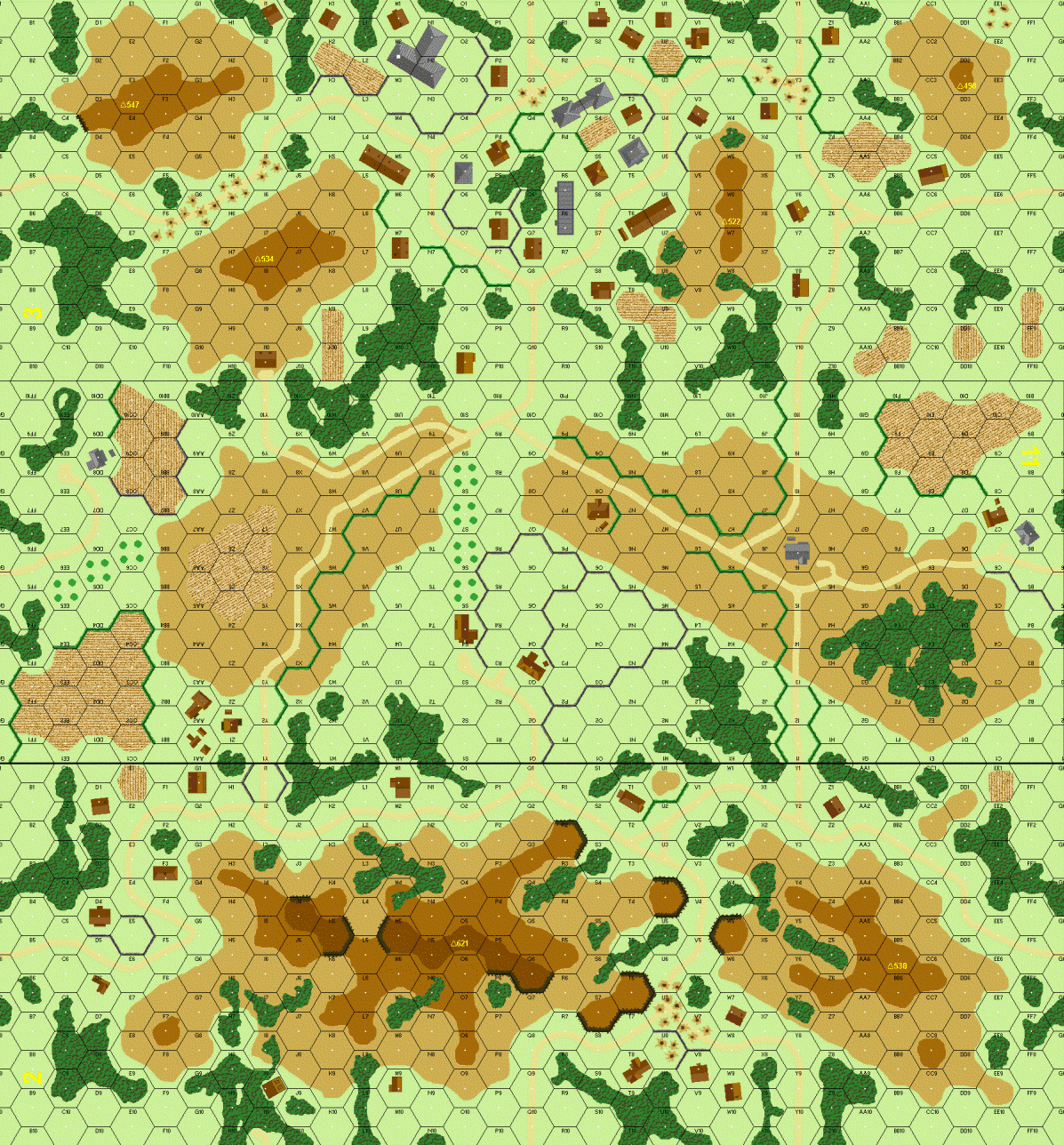 The combined ROAR and Archive record has this with a total record of 25 Yugoslavian - 8 German, indicating the challenge facing the Germans in this scenario (albeit some may be duplicates). The Germans must likely get all their vehicles exited, plus several EVP of infantry - unless they can kill a lot of Yugoslavian troops. As the Germans - looking at the maps - it seemed like an assault on the "open" side of Board 3 would be best. This side is dominated by hills 522 and 498, with a substantial amount of open ground, but does not force the German infantry and armor to fight through a ton of buildings. Sixteen Green Yugoslavian squads in the village can be expected to get more than a few Street Fighting attacks via tanks and probably get a few kills/immobilizations; this not counting any Elite squads in the village. So, around the edge of the village for me. Sent two of my ACs to interdict movement in the center of the village for a few turns; the third AC sped around to try to get some SD smoke to cover the Motorcycle troops. On turn 2, the latter reached the small clump of two buildings near the number on Board 11. On turn 3, the two OT ACs moved to try to cover the cycle troops with SDs; they both gacked that, but only two squads broke on their dash to the woods just over the edge onto Board 3. Had to dismount at this point, too dangerous to bail out. One AC broke/pinned the Yugo stack in hex Y8 on Board 3 and my tanks rushed up to finish of that stack - eliminating them all for failure to rout. On turn 5, I was able to get two SD smokes (good timing!) to cover my infantry rushing across the last bit of real open ground. I was able to kill two more squads for failure to rout; one broke from a desperate Sustained Fire shot from one AC. At the end of turn 5, I had three tanks and one AC covering the Y1 exit hex and surrounding hexes. Additionally, one OT AC was on the top of hill 498 to interdict the road and hexes leading toward the Y1 exit area. I had four squads near tha exit area and had killed six Yugo squads and a 9-1 leader. Quite a few Yugo squads were still a turn away from covering the Y1 exit hex. Dan conceded at this point. I think he still had a reasonable chance of taking out (by luck, hook, and crook) one of my vehicles as they tried to exit - just by packing the nearby exit hexes with several Yugoslavian squads each. This tactic would have also probably have stopped my infantry (cannot move through un-disrupted enemy units...), but such a tactic would likely have resulted in several more Yugo squads KIA'd - enough to allow just exiting the German vehicles to win. So, with Dan conceding, we called the game with a German win. Very tough for the Germans. Any future scenario revision should expand the exit area by 3-5 hexes on both sides (e.g., to perhaps hex CC1 from Y1); that simple change would get this one much more balanced.