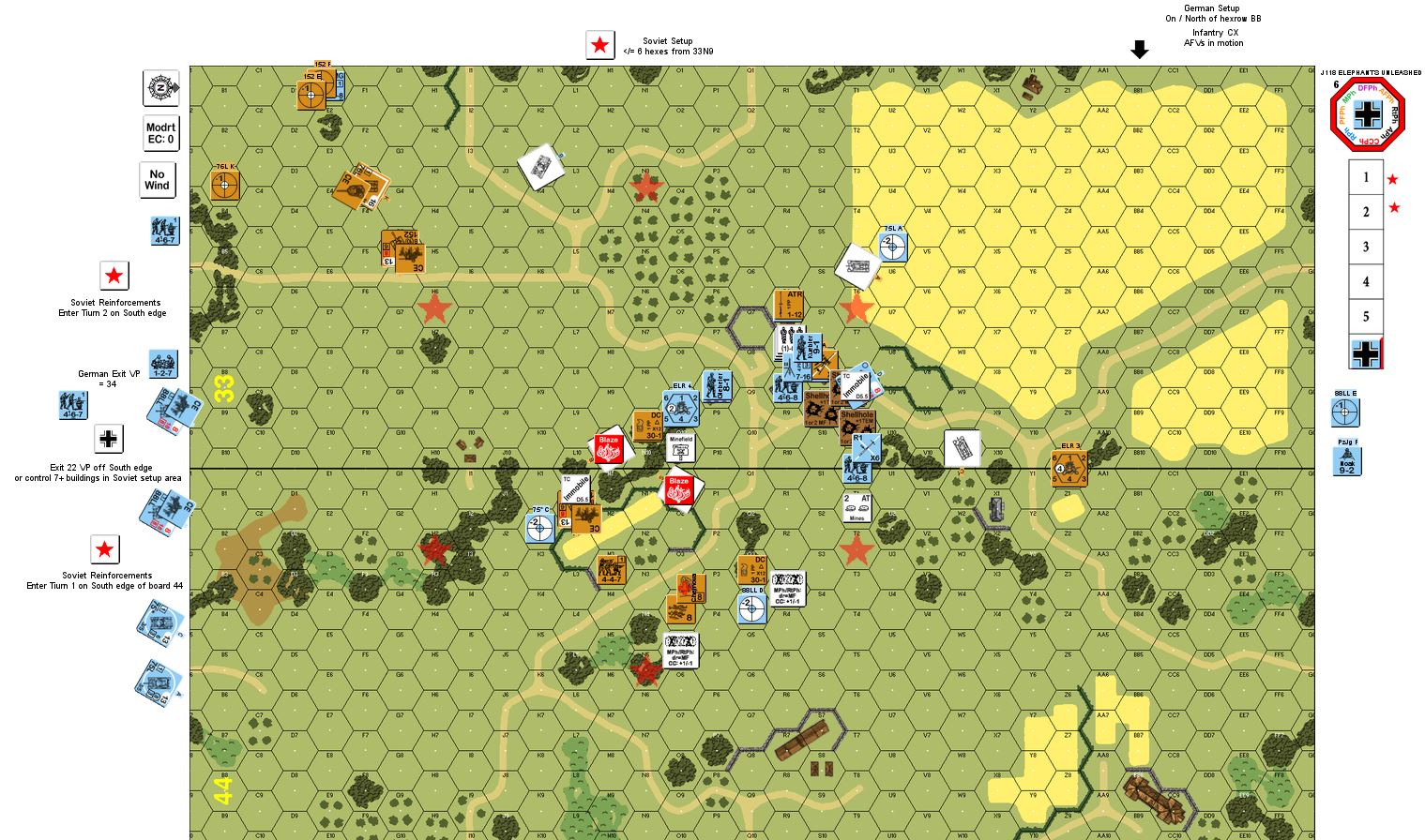 The battle for Kursk had begun. After breaching the first line of defense, the 86. Infanterie-Division supported by the gigantic Ferdinand tank destroyers of schwere Panzer-Abteilung 654 continued toward the Russians' second defensive belt. But the Russian 27th Guards Tank Regiment supported by engineers was about to mount a counter-attack. The Germans would pay in blood for every inch gained of Russian soil.- - - - In the mid-sized 5.5-turn "Elephants Unleashed", a German combined arms force fight their way through minefields, wire, Russian infantry and counterattacking T-34s. Find out for yourself if the lack of a bow machine gun was really the Ferdinand's Archilles' Heel.Attacker: German (Panzer-Division 18, Infanterie-Division 86 and schwere Panzerjäger-Abteilung 654)
