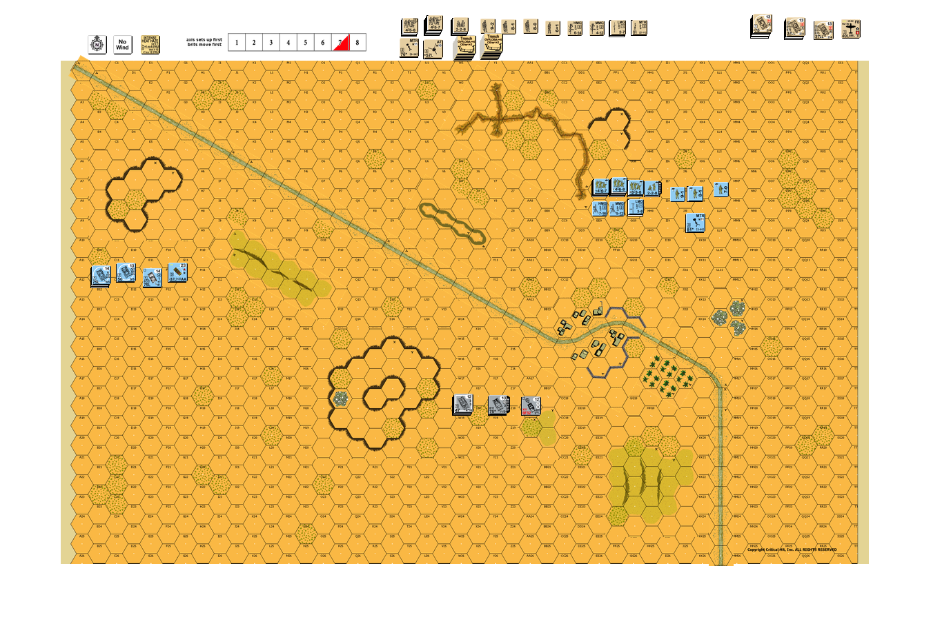 | Misc Rules: | Intense Heat haze. A: AirSup w D: Germans can set up HIP both Guns |