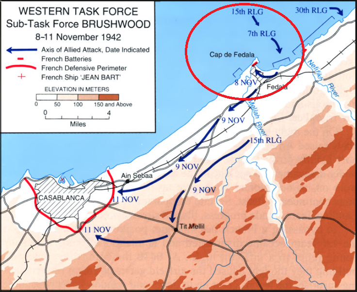The objectives of BRUSHWOOD were to silence all coastal batteries, seize the town and port of Fedala as well as all roads and rail lines serving them, and then turn south to envelope Casablanca from the landward side. To reach these objectives, individual battalion landing teams were to come ashore over four beaches along a four-mile arc of coastline bounded by two rivers, the Nefifikh on the east and the Mellah on the west. The first troops ashore were from 1st Battalion, 7th Infantry, reaching Beach RED 2 at 0500 hours. The companies of 1-7 Team moved inland toward Fedala and engaged a surprised contingent of the 6th Senegalese Infantry Regiment.Attacker: American (Elements of the 1-7 Battalion Landing Team)