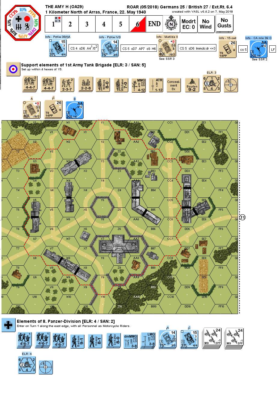 While refueling and reloading shells expended during the raid on Arras, a tank crew belonging to Lt. Harold McGreggor was brewing tea when they were alerted to the presence of a German column advancing along the road into the rear areas north of Arras. McGreggor quickly organized the Security and Supply Company into fire teams while his crew finished loading the last of the 40mm shells into their racks. As McGreggor mounted his tank, the sounds of approaching motorcycles could be heard. A cloud of dust and roar of engine noise announced their arrival as dozens of motorcycles appeared at the end of the street. McGreggor lowered his head through the hatch and ordered his Matilda into motion.Attacker: German (8th Panzer Division)