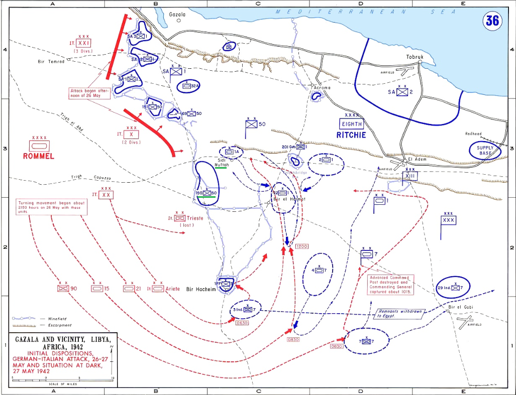 The "Gazala Line" was a series of occupied "boxes" each of brigade strength set out across the desert with minefields and wire watched by regular patrols between the boxes. The Free French were to the south at the Bir Hakeim box. The line was not equally staffed with a greater number of troops covering the coast leaving the south less protected. By late May Rommel was ready. Facing him on the Gazala defences were 1st South African Division, nearest the coast, 50th (Northumbrian) Infantry Division (on their left) and 1st Free French Brigade furthest left at Bir Hakeim. The British 1st and 7th Armoured divisions waited behind the main line as a mobile counter-attacking force while 2nd South African Division formed a garrison at Tobruk and 5th Indian Infantry Division (which had arrived in April to relieve 4th Indian Infantry Division) were held in reserve. The 150th Infantry Brigade position at the start of the battle can be seen in the map (right). For almost 72 hours (29–31 May 1942) during the battle the 150th Brigade and the 44th Royal Tank Regiment held out against Erwin Rommel's concentrated attacks, without any support. On 1 June, the German Army finally forced their surrender.Attacker: German (104th Panzer Grenadier Regiment and 21st Panzer Division)