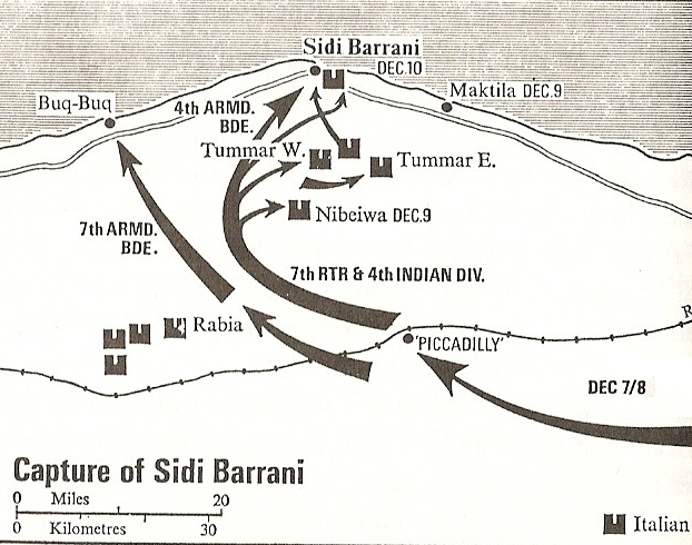 The final tasks for Operation Compass were to mop up the remnant of the retreating Italians and to wrest Sidi Barrani from the 4th MVSN Division, all in the midst of a paralyzing sandstorm. The Blackshirts were dug in and waiting for the other shoe to drop. The 16th British Brigade, with the addition of the Cameron Highlanders, help from 4th Armoured Brigade, and the entire weight of the division's artillery, attacked Sidi Barrani at 1600 hours.Attacker: British (2nd Cameron Highlanders, 2nd Royal Tank Regiment, and 7th Royal Tank Regiment)
