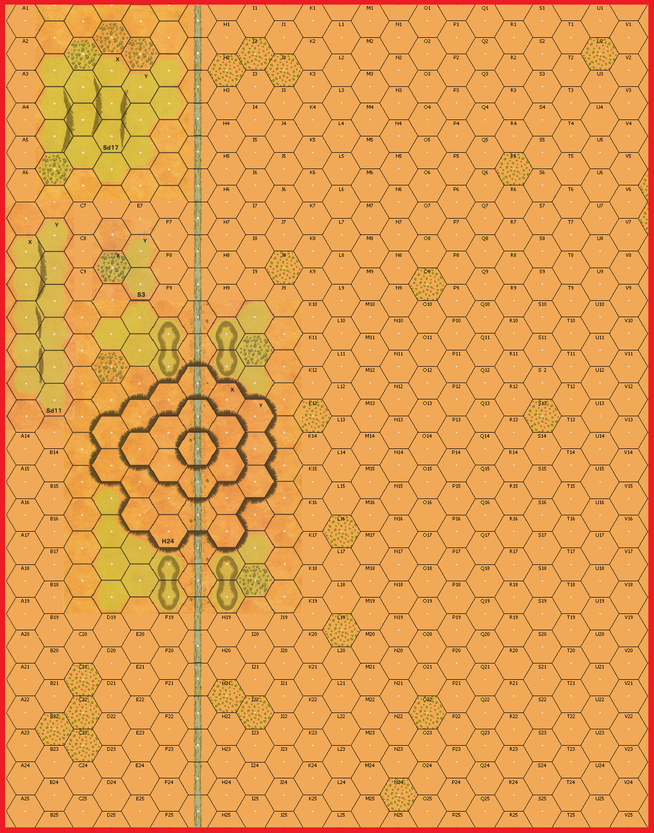The famed Desert Rats were on the move. Heading for the African coast through the Saleh/Beda Fomm area, they planned to set up ambush positions against the large Italian motorized columns retreating from Benghazi towards Tripoli. The 2nd Royal Tank Regiment took up positions on a large hillock bisected by the only road to Tripoli and dotted with graveyards. A short time after their arrival, two single decker buses appeared from the road from Benghazi. They were stopped, the civilians sent away, and the buses positioned as roadblocks. With dawn came the Italian vanguard -- the rump of the army that had once invaded Egypt with expectations of conquest. As enemy transport lined the roadway, two waves of Italian mediums crashed into British positions on 'The Pimple'. Reinforcements in the form of A9s from 2nd RTR soon arrived. (See J47 "They're Here! Reverse!")Attacker: Italian (5th Medium Tank Regiment and 60th Sabratha Division)