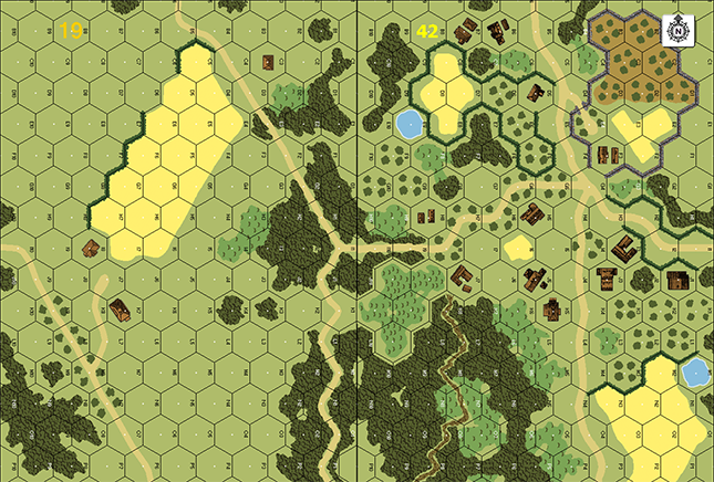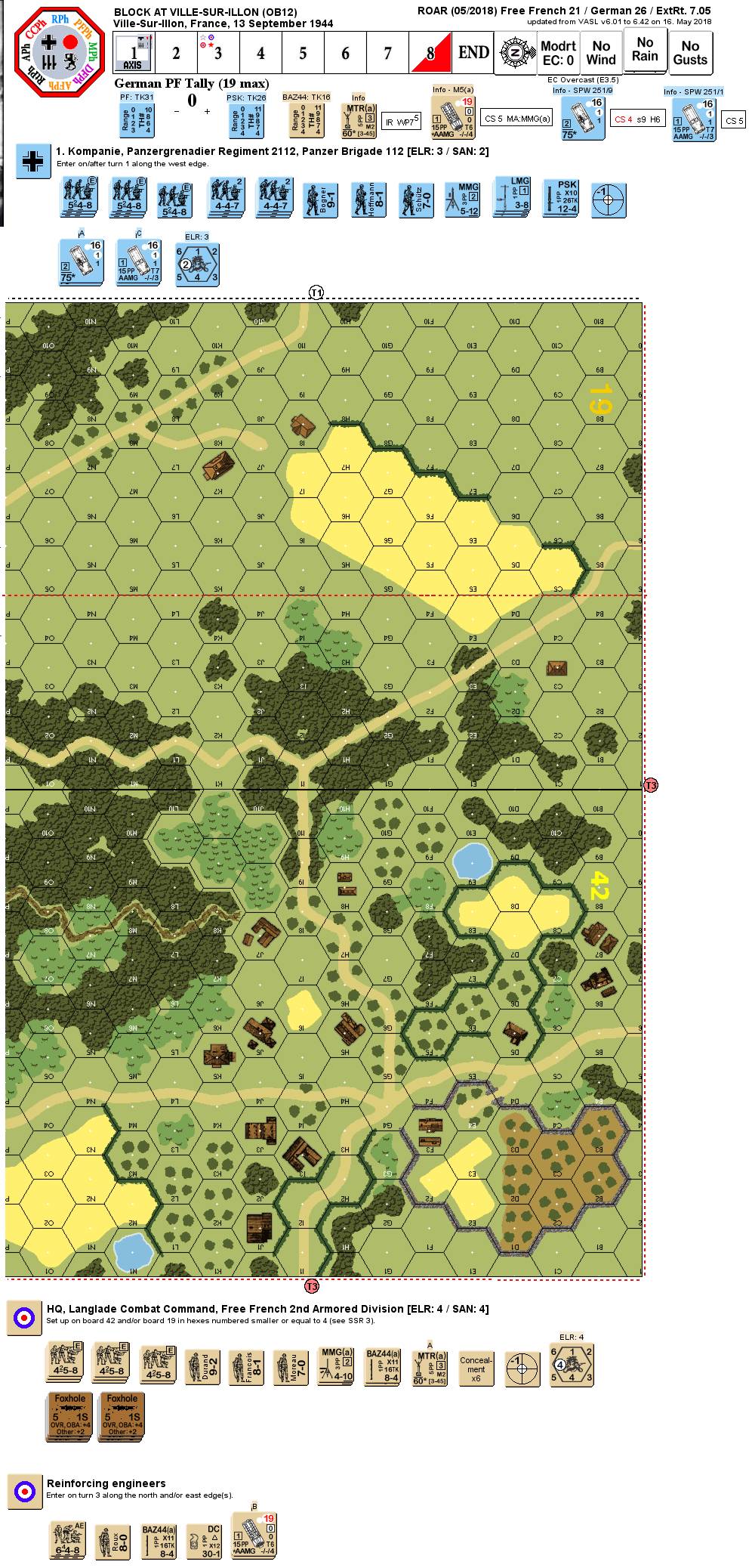 Looked like an interesting scenario with lots of moving around, repositioning, and delaying action. I had the Free French in this one, who wasted some of my sympathies for them because I had to learn that despite using British counters, they are subject to Cowering... The Germans need to capture a number of buildings on board 42, which is not renown for having lots of clear LOS. With the OB-given Foxholes, an up-front defence seemed in order as the attacking Germans had to cross a rather open board 19. The Southern (left) side was protected by no less than five hexes of OG. The south offered the protection of a large grainfield and a hedge to hide behind on the advance. Thus I put my Schwerpunkt on my right side. The left open ground was covered by no less than 2 full squads, one with MMG, the other with 60mm MTR and 8-1 to either to be in place to stop an approach on that flank or poised to redeploy to the central woods quickly to cover the 19I1-A3 axis and 19I1-P4 axis simultaneously. Together with the 2nd MMG, approaches to the central woods area could be covered by Fire Lanes. On the right, the B4/A4 gap was heavily covered by 4.5 squads, the 9-2, MMG, and a BAZ, partly taking advantage of the 19I1-A5 axis. The two squads & leader required to set up in the headquaters buliding were able to rush to the right flank or center as reinforcements where needed. My plan for them saw them in the center, while the right would be strenghtened by the reinforcements of Free French turn 3. Overall, I think, my plan to slow the attackers on the rather dangerous grounds of board 19 to then fall back delaying the German was sound.