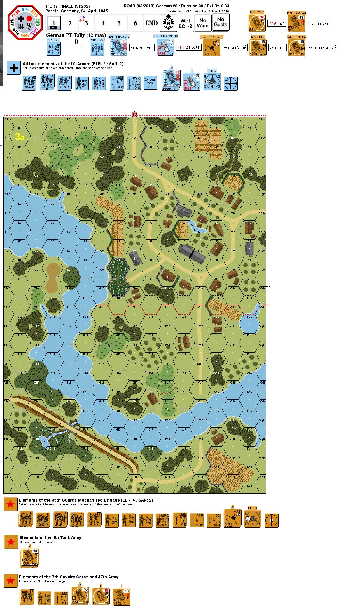 The 35th Guards Mechanized Brigade was given the mission to encircle Berlin from the south. Upon reaching the Havel River, volunteers from the 1st Company swam it to retrieve a barge, and quietly ferried the company across. On the north bank, the 1st Company stealthily observed four Tigers camouflaged in the blooming gardens of town, and began to arrange for a surprise attack – including 57mm AT guns that were ferried across, positioning of tanks south of the river, and coordination for artillery strikes. Suddenly, their company commander, who during several weeks of fighting stayed hidden at rear headquarters, showed up from nowhere, and yelled at the troops to follow his charge into town. Several of the soldiers ran forward, thereby foiling the carefully planned trap. As the company commander’s charge approached town, a hidden flamethrowing halftrack appeared. . .Attacker: German (IX Army)