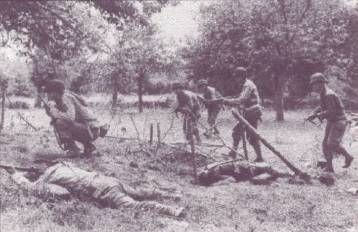 The 442nd RCT had been given the task of securing the small town of Bruyeres as the first assignment for the 36th Texas Infantry Division. After eliminating four machine gun nests and two roadblocks, the 100th Battalion advanced 300 yards into the surrounding woods and foothills that dominated the area west of Bruyeres. Elements of the 232nd Combat Engineers were then called in to clear the road so that armor could be brought up in support of the infantry. Unfortunately the SS were not so willing to leave and infiltrated back to the road behind the 442nd.Attacker: American (Elements of the 232nd Combat Engineers and B Company, 100th Battalion, both of the 442nd Regimental Combat Team)