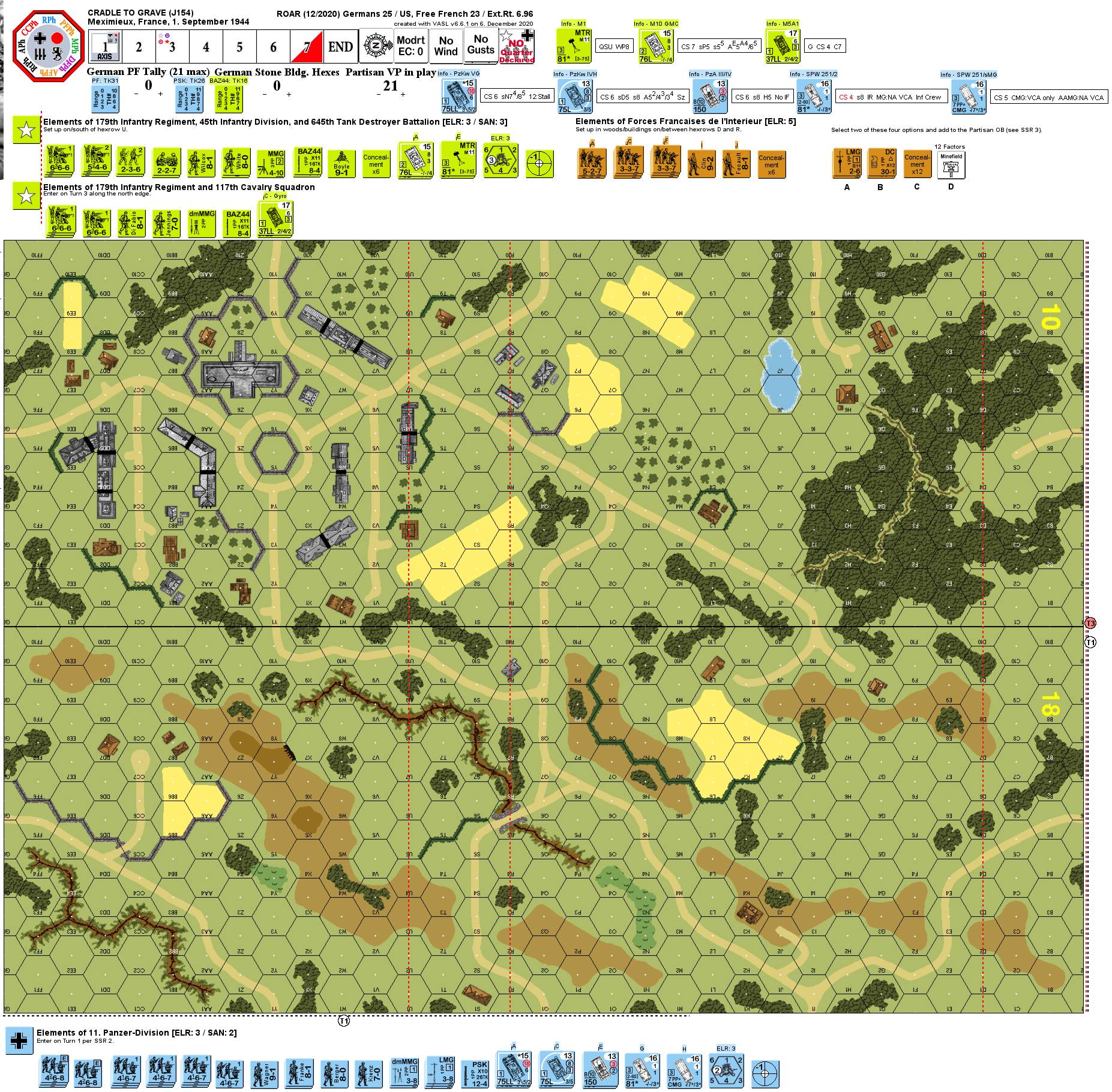 | Misc Rules: | NQ in effect. D: M5A1s have Gyrostabilizers. Variable Partisan OB - DCs, Mines or ? counters |