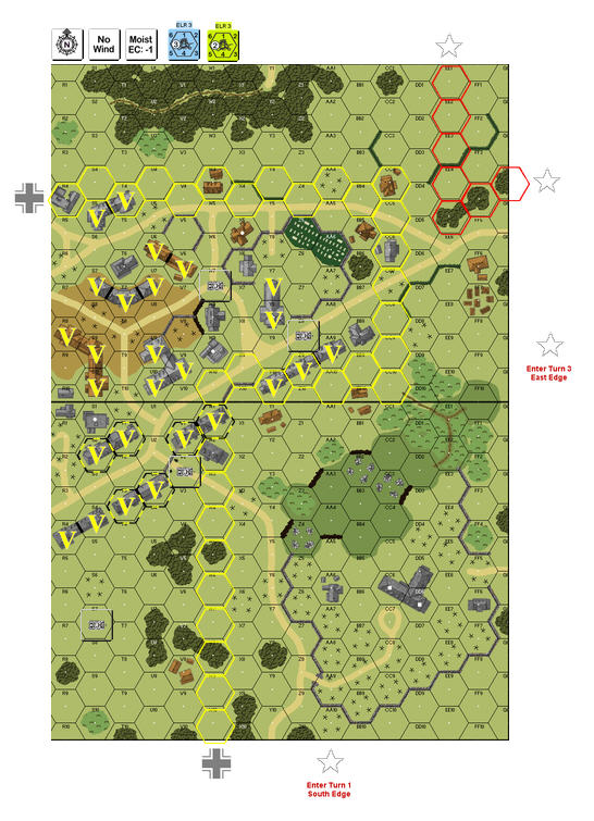 | 2025-12-29 | (A) Douglas Leslie | vs | Eric Partizan Eric | American win (VASL Log) | The Americans were able to find smoke at will and this enabled them to close quickly with the German defenders. Eric conceded at the end of turn three with the Germans down to two unbroken squads and only one US tank destroyed. This one is fun to play but feels pro-American, as the recorded results tend to suggest. | ||