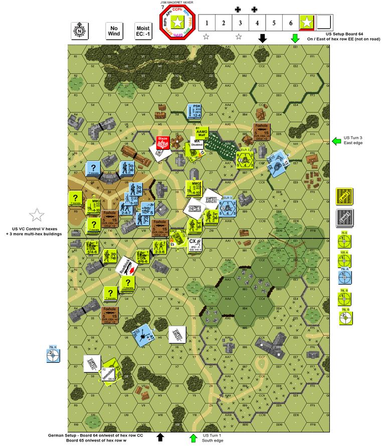 | 2024-12-08 | (A) Vic Lauterbach | vs | JM | American win | I drew the GIs and was badly diced in Turn 1; my squads failed every MC and Jim's passed them all! A barrage of US fire produced one pinned 247 and a broken 228! In exchange, I lost 2 HS, had 4 broken MMC and disabled a 75 MA. As always, the GIs bounced back fast and took buildings R4 and U3. I finally took 64V1 in turn 5 after winning a 3-turn melee, giving me all 3 VC buildings plus R8, Y7 and Y10. Jim's force was squeezed onto hill T8 plus building U9. Despite Jim's furious counterattack, I held on for the win. It's gamey, but tank MA repair drs are huge! Jim: The German force is too small to defend the whole village, so I concentrated on the hill and VC buildings plus the U7 church. Once I lost six buildings, I went after the remaining three US tanks. I got two, and Vic got the win. Very good game! The "reviving" Panzer is a neat "wild card!" | ||