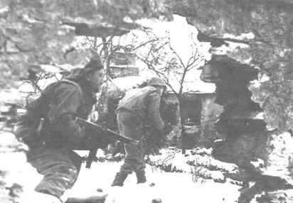 By the middle of January, “Easy” was on the attack again. Although many replacements had come into the ranks, some of whom were not even paratroop-qualified, Major Dick Winters entrusted them with one more assault to retake ground east of Bastogne lost a month earlier. The “Screamin’ Eagles” griped and moaned in the freezing Belgian countryside, but Easy Company’s vets followed Winters’ orders – and the replacements followed the vets. Upon entering the smoking ruins of Noville, there was an immediate counterattack by Panzer-Division 9. Winters led the remains of the 2nd Battalion to secure the town, which was infested with German snipers. The resulting losses left him with only 20 or so men who had dropped along with him on D-Day.Attacker: German (Panzer-Division 9)
