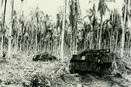 Contrary to their ineffectiveness in the ETO. the Allies' light tanks were a real plus in jungle fighting. Supported by a platoon of "Honey" tanks, C Company advanced towards some Japanese bunkers in an attempt to break though to the coast.Attacker: Australian (C Co, 2nd Bn, 9th Inf Brigade)