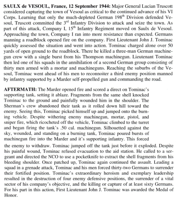 Major General Truscott considered capturing the town of Vesoul as critical to the continued advance of his VI Corps. He committed the 3rd Infantry Division to attack and seized the town. As part of this attack, Company I, 15th Infantry Regiment moved on Saulx de Vesoul. Approaching the town, Company I ran into more resistance than expected. Germans manning a roadblock opened fire on the company. 1st Lt. John Tominac quickly assessed the situation and went into action and won the Medal of Honor and won the Medal of Honor.Attacker: American (Co. I, 15th Infantry Regt, 3rd Infantry Division)