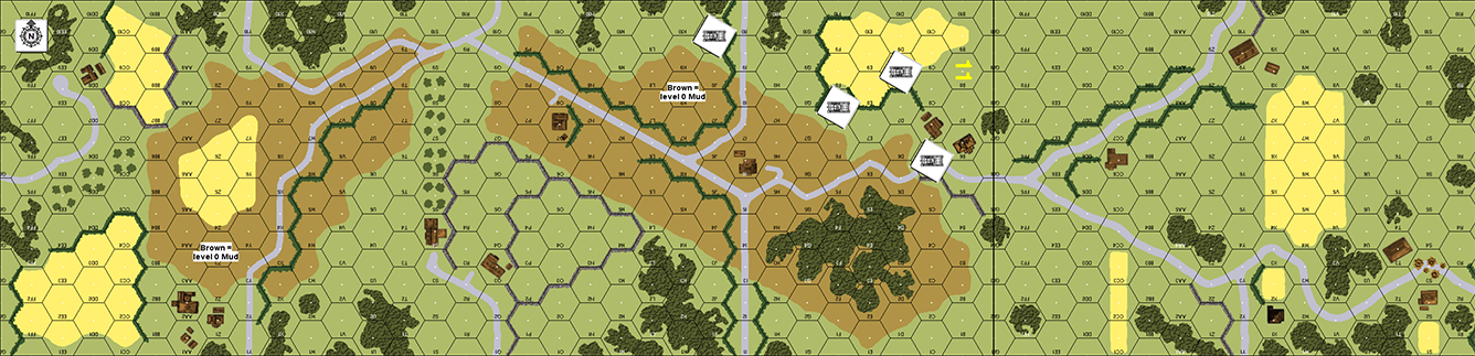 | Misc Rules: | Grain is in season. Treat hills as ground level Mud. VC: Canadian must control 3 Pillboxes/trenches |