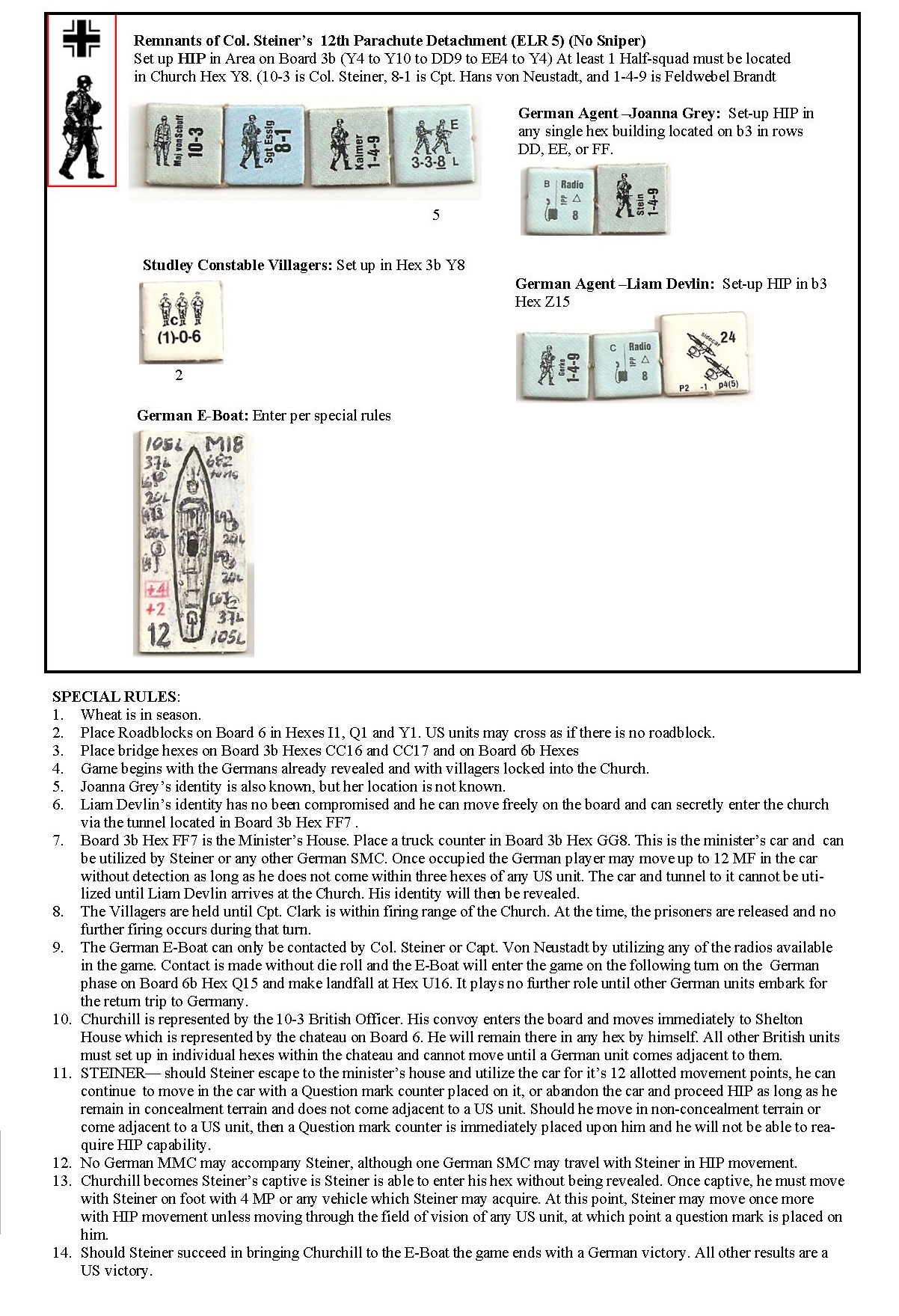 Oberst Kurt Steiner and an elite Group of German Paratroops descend on Studley Constable with the intent to kidnap Winston Churchill. A tragic mishap reveals them to the village as Germans. Local US Rangers stationed nearby head to the village to stop the German attempt. Surrounded and outnumbered...Steiner and his men remain determined to succeed…Attacker: American (2nd Ranger Battalion)