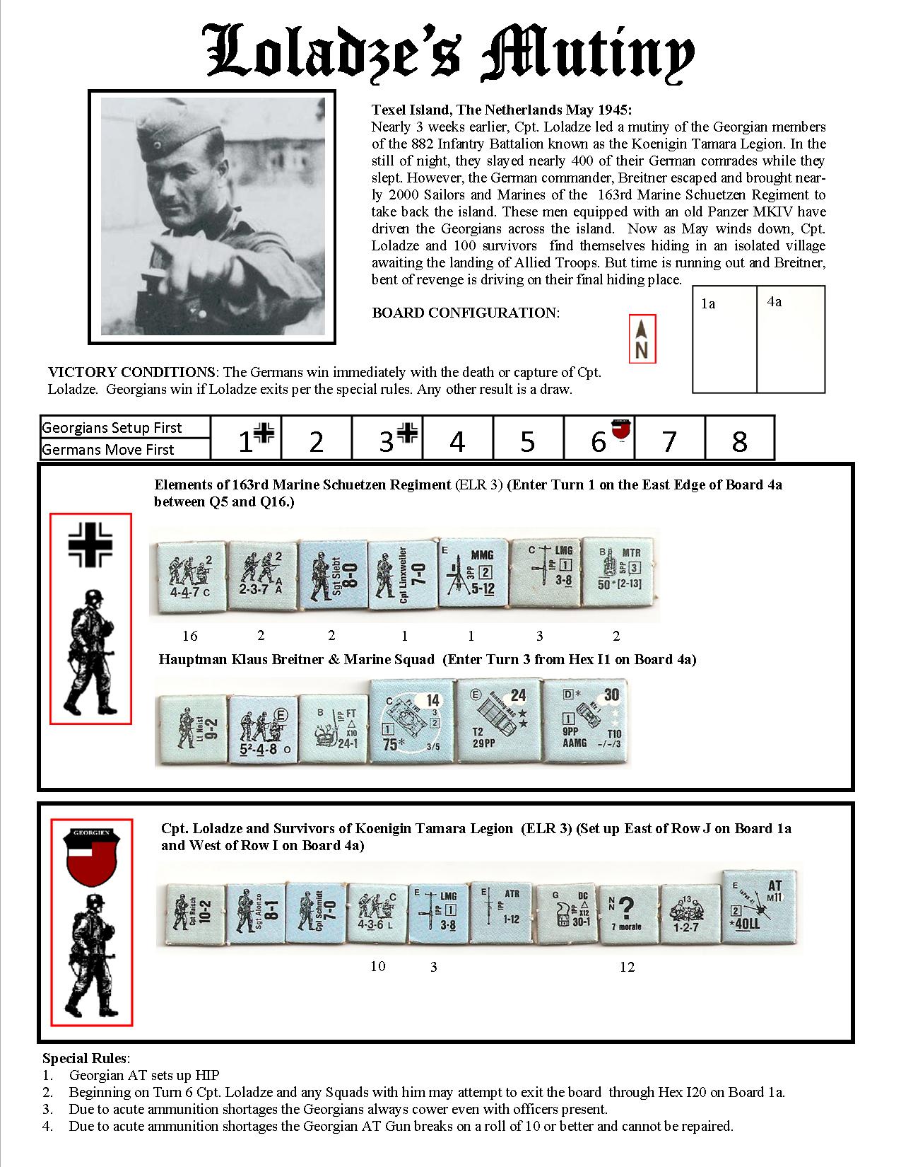 Nearly 3 weeks earlier, Cpt. Loladze led a mutiny of the Georgian members of the 882 Infantry Battalion known as the Koenigin Tamara Legion. In the still of night, they slayed nearly 400 of their German comrades while they slept. However, the German commander, Breitner escaped and brought nearly 2000 sailors and Marines of the 163rd Marine Schuetzen Regiment to take back the island. These men equipped with an old Panzer IV have driven the Georgians across the island. Now as May winds down, Cpt. Loladze and 100 survivors find themselves hiding in an isolated village awaiting the landing of Allied Troops. But time is running out and Breitner, bent of revenge is driving on their final hiding place.Attacker: German (163rd Marine Schuetzen Regiment)