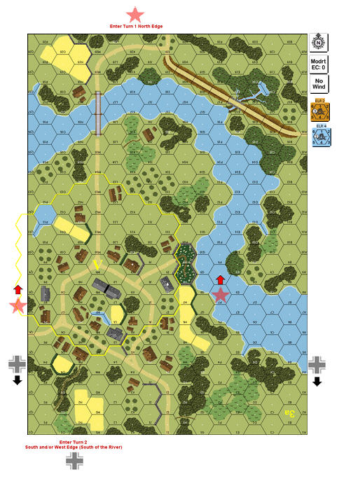 The 43rd Motorcycle Infantry Battalion was racing through the Ukraine on a country road. They were trying to catch up to the armored cars that were entering a small town to the front. Suddenly the armored cars were racing back down the road through them. Russians had been spotted and they had tank support. It was decided that the motorcycle infantry would dismount and advance into the town with anti-tank support showing up when it was ready. The anti-tank guns were being towed by Kubelwagens and would need time to catch up. The motorcycle infantry and part of the armored cars advanced forward with caution to the edge of town. Once there, the infantry dismounted and caught the Russian infantry by surprise.Attacker: German (43rd Mototcycle Infantry Bttalion, Panzergruppe Kleist | 13th Panzer Division)