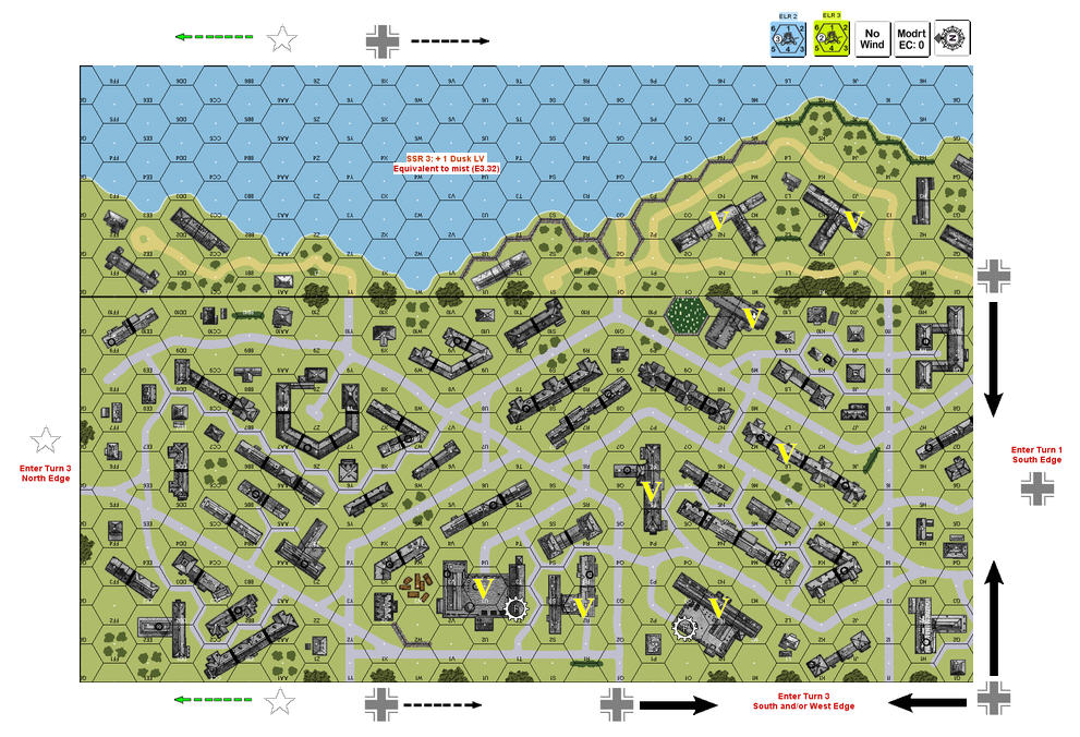 | Errata: SSR 3 says "A +1 Dusk LV Hindrance equal to Mist (E3.32) is in effect". Delete "+1". Question: The scenario card specifies that only hexes west of the river are in play. There are pair of hexes such that LOS between them cross hexes that are not in play. Are such LOS blocked because of crossing such out-of-play hexes? Answer: No. Question: SSR 1 specifies that "all buildings are stone". Is the Lumberyard stone? Answer: No. Question: Per SSR 2, Printed stairwells do not exist. Which of the large round center dot (B31.3), the white square (B23.23) or the white cross (Steeple; B31.2) are considered Printed stairwells? Answer: Only the white square is a Printed stairwell. | http://www.friendlyfire.se/asl/packs/8/ |
