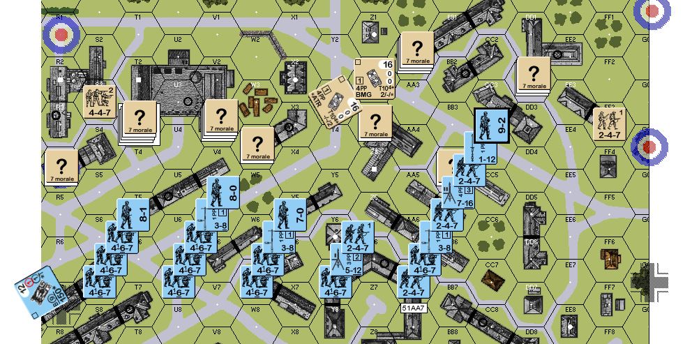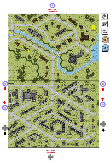 Nice scenario. Played this as the attacking Germans. The beginning went off very well. I found his hidden 8-1/457/ATR combo during the first MPh in Z3 where it screwed up a stack of mine wanting to go up the stairs in Z4. Another of my 467/LMG was broken in Y5 when it entered. So basically most of my force to cut British retreats was in a shambles. On my left flank (west) things went very well, though. I was able to close in to the S4, S3, T3 buildings quickly and annihilate the entire British force of 5 squads, 8-0, a created leader, LMG & ATR there after my turn 3 poised to push through in force beyond. By that time, his other troops were pinned to the Z1, AA1 area with not much possibility to retreat. Then I misplayed two AFV losing one PzII to an unneccessary ESB and leaving aonther out of position. After that I recovered and occupied the victory building in turn 4 with one PzII guarding the western bridge. The area was completely free of enemy infantry by now. in the Z1, AA1, CC3 area I put up strong pressure on the British infantry forces there, too. In the process, the two PzI's were lost. One being sacrificed, the other being lost with a bit of bad luck to a single leader in CC. The British hung on in H1 and I1, but things looked bright. Meanwhile the British reinforcements came in putting a strong guard on the eastern bridge with all but the A9 tank which was deftly placed in 23J4 where I had difficulties to get at it. Then it malfed all three of its MGs which created an opening for my infantry to close in to the 23K4 building in force. By the end of turn 5, the British infantry was out of the game except for one 457/ATG pestering my rear area and managing to shock the sIG 1B which eventually died. But I could try what I want - I just could not harm his tanks: 40 TH rolls, 18TK rolls with 20L guns, ATRs, and many MGs did not manage any effect whatsowever (TH average was 7.25, TK average was 8.67 !!). Before I could take out his A9 in CC, it managed to kill one of my two remaining PzIIs with after needing a TH of 4. With my last surviving AFV (PzII) I managed to neutralize one of his Mark VIs and his last squad driving into its hex in the my last turn by target selection limits. On the missing bridge, he had one motion Mark VI and a single 8-0 leader. Adjacent to the bridge, at the end of my last MPh I had my broken 9-2, the rest of the forces were GO: A 9-1, 8-0, 2x 468, 1x467. So the upcoming CC seemed winnable. In his last DFPh he called for snakes for his last HS - and of course got them. My GO 9-1 got HoB, battle hardening and becoming heroic. Despite the upped leadership, two of the squads and the 8-0 broke rolling more than 8 with which they would have remained unpinned. Damn it! So my menacing force to cope with his Mark VI and his 8-0 were down to my heroic 9-2 plus a 468. However, in Advancing fire, I had no less than 3.5 squads a (previously stationary) HMG, an LMG and the heroic 9-2 to fire at the frigging 8-0 as part of a FG. He only pinned. Damn him! Now, in CC my chances had been reduced from very good to rather slight. But it turned out we did not need to bother: A heroic 9-2 and an elite 468 may look like hard-asses. But the 9-2 rolled 11 when attempting to help the squad with the PAATC. Game over. Thus I managed to snatch defeat from victory in the last half-turn. Besides that, the game was much fun, though.