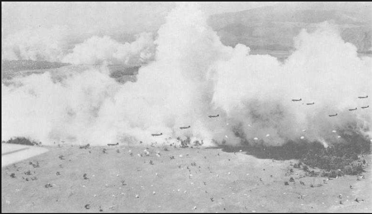 Silhouetted against clouds of smoke (created to provide concealment), C-47s from the USAAF drop a battalion of the 503rd at Nadzab, New Guinea.
