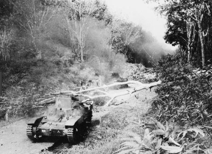 Type 95 Ha-Go tanks fight through a roadblock in Malaya