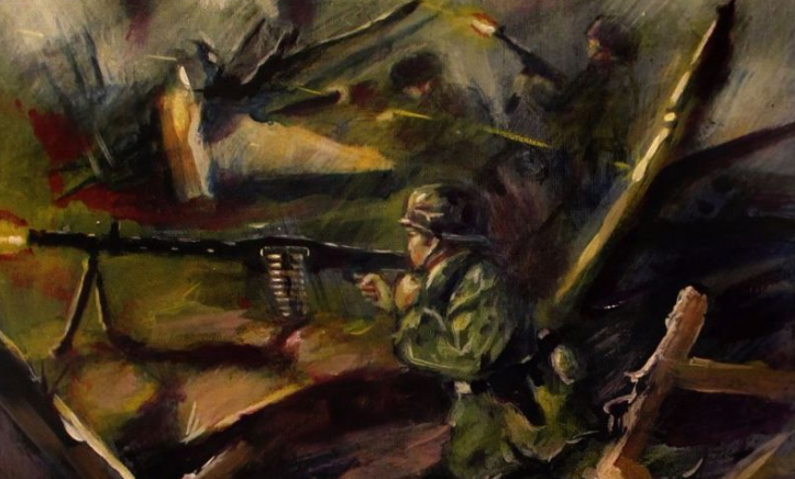 By mid-summer, Third Army’s drive across northern France was moving so quickly that it outran its supply sources, and not enough trucks were available to transport supplies to every front line unit. On Patton’s orders, supplies were dumped at the side of the road and left under the guard of whatever troops were available to care for them. When gasoline for the 6th Armored Division was dropped in the fields near Lesquern, the only GIs nearby were the Division Band and a few light tanks – with retreating German paratroops lurking about. Guided by a French traitor, a motley force of Fallschirmjager and fortress troops set upon the gasoline dumps.Attacker: German (Fallschirmjager-Regiment 2 Infanterie-Division 266)