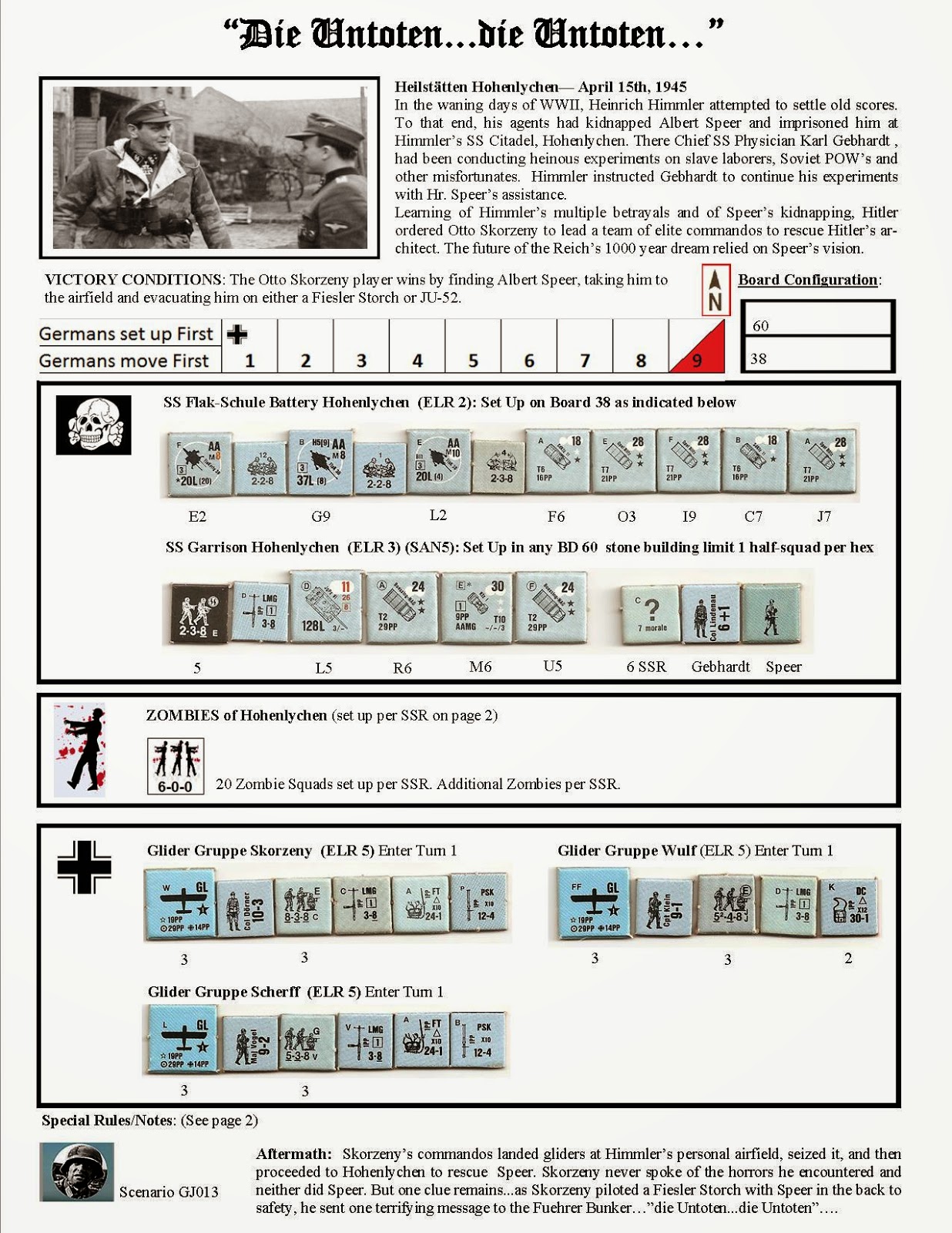 In the waning days of WWII, Heinrich Himmler attempted to settle old scores. To that end, his agents had kidnapped Albert Speer and imprisoned him at Himmler’s SS citadel, Hohenlychen. There Chief SS Physician Karl Gebhardt had been conducting heinous experiments on slave laborers, Soviet POWs and other misfortunates. Himmler instructed Gebhardt to continue his experiments with Herr Speer’s assistance. . .Learning of Himmler’s multiple betrayals and of Speer’s kidnapping, Hitler ordered Otto Skorzeny to lead his team of elite commandos to rescue Hitler’s architect. The future of the Reich’s 1000 year dream relied on Speer’s vision.Attacker: German (Glider Gruppes Skorzeny, Scherff and Wulf)