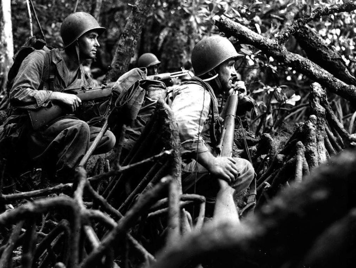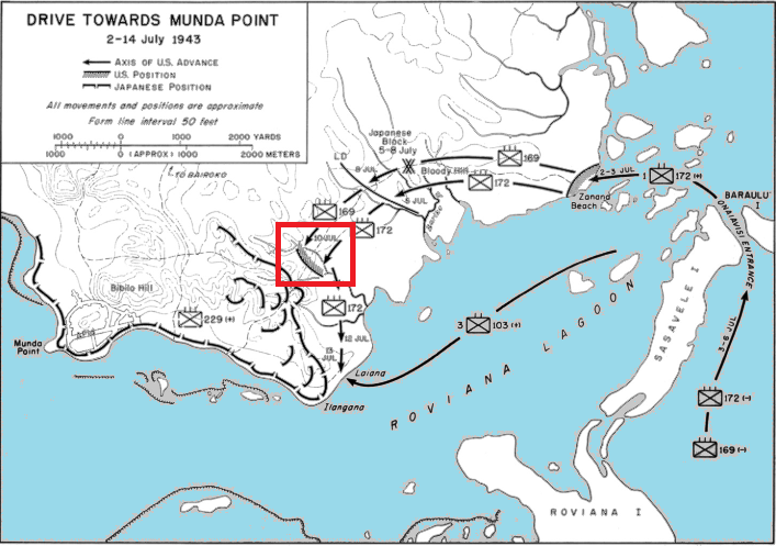 The main attack on Munda Airfield came from the east by the 43rd Infantry Division. The main line of defense ran from Ilangana on Roviana Lagoon northwest for 3,000 yards, manned by the Japanese 229th Infantry Regiment. The defenses centered on mutually-supporting pillboxes of log and coral in well-concealed terrain. The assault began on 7 July from a line of departure on the Bairike River. Two days later, the Defense Battalion, landed at the western tip of Munda Point to participate in a quick strike that the Allies hoped would put Munda Airfield in their hands in a few days.Attacker: American (172nd Infantry Regiment, 43rd Infantry Division)