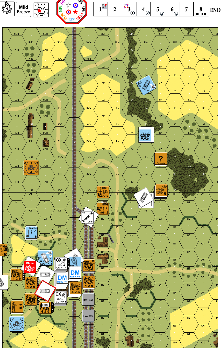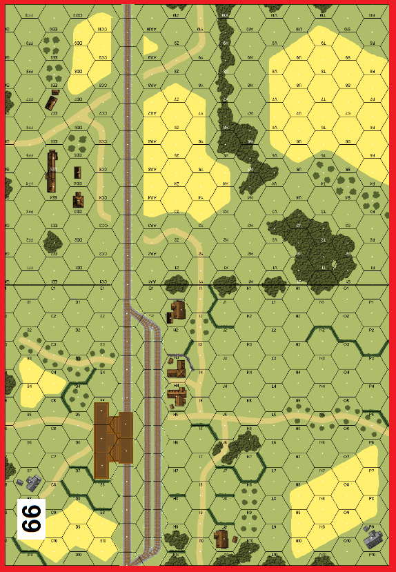 | Misc Rules: | All buildings wooden. Boxcars on track hexes 66G5-G8. A: FTV3 |
