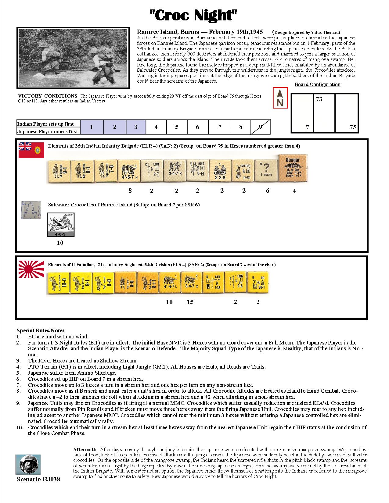 | Misc Rules: | PTO (G.1), Night Turns 1-3, NVR: 5, Mud (E3.6). Crocodile rules (HIP, Berserk, HtH CC Attacks) |