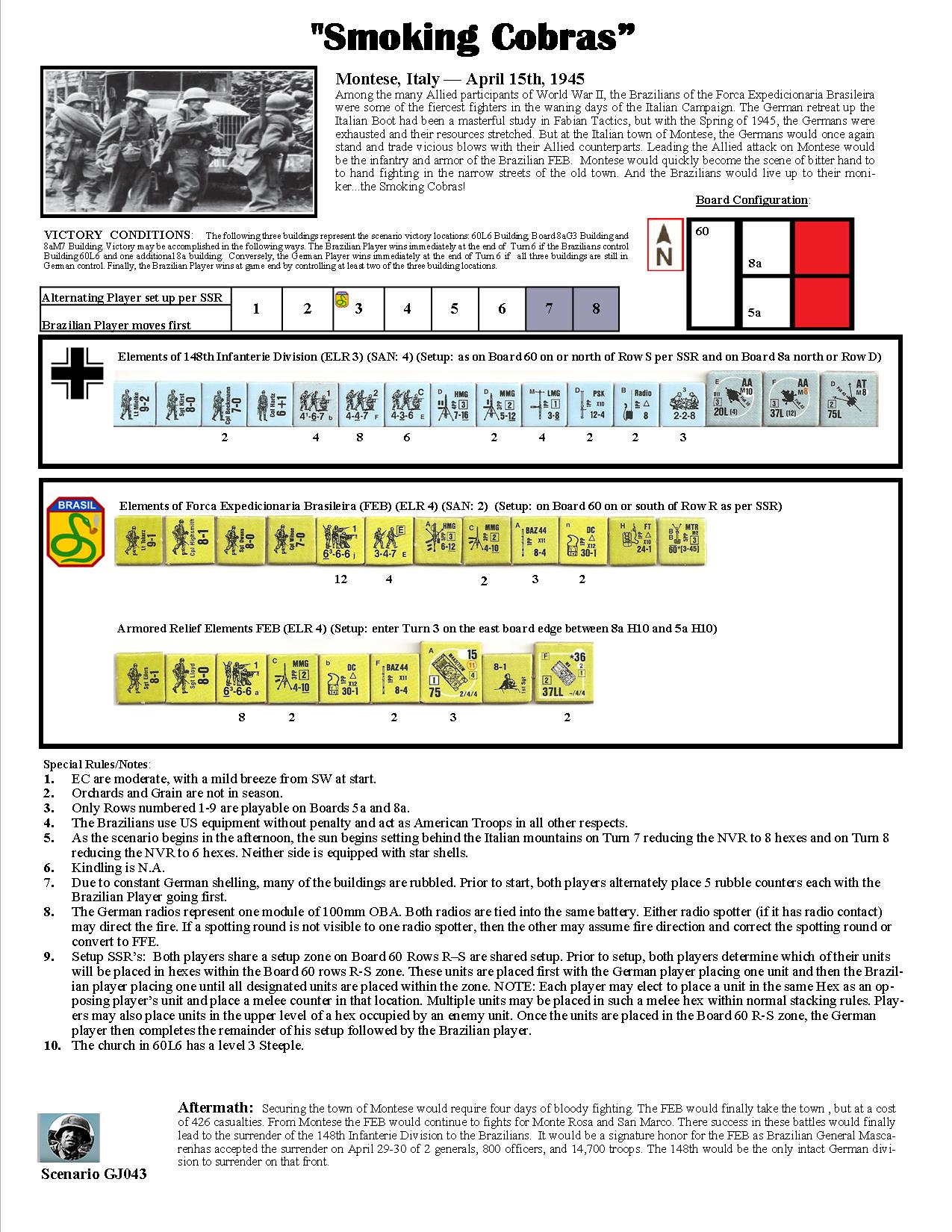 Among the many Allied participants of World War II, the Brazilians of the Forca Expedicionaria Brasileira were some of the fiercest fighters in the waning days of the Italian Campaign. The German retreat up the Italian Boot had been a masterful study in Fabian Tactics, but with the Spring of 1945, the Germans were exhausted and their resources stretched. But at the Italian town of Montese, the Germans would once again stand and trade vicious blows with their Allied counterparts. Leading the Allied attack on Montese would be the infantry and armor of the Brazilian FEB. Montese would quickly become the scene of bitter hand-to-hand fighting in the narrow streets of the old town. And the Brazilians would live up to their moniker...the Smoking Cobras!Attacker: Brazilian (Forca Expedicionaria Brasileira)
