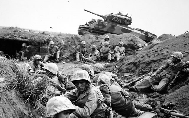 On the morning of February 26th, two Battalions of the 9th Regiment, 3rd Marine Division moved towards the area at the foot of Hill Peter. The jumble of rocks and blasted rubble at the foot of Hill Peter were the last major obstacle to securing the Motoyama Number 2 Airstrip. The assaulting Marines were quickly shredded by the machine guns of the emplaced Japanese. Supporting Sherman Tanks were no more successful and fell victim to Japanese anti-tank fire. Within minutes the attack was completely stalled. Three Sherman Tanks named Agony, Angel and Ateball were knocked out in the assault. Angel and Agony were burning wrecks, while Ateball was only immobilized. Near the tanks, crouched in shell holes were those Marines who had survived the withering Japanese fire. Lying in a crater in front of the Ateball was Corporal William R. Adamson, who had managed to escape from the burning agony. As the Marines prepared to rescue their brother Marines at the foot of the hill, a company of Japanese were gathering to rush forward and destroy the remaining Marine Sherman. Bleeding badly from a leg wound, Corporal Adamson nevertheless, stayed in the fight and signaled the crew of the Ateball and helped direct their fire at the various Japanese machine gun positions.Attacker: American (USMC) (9th Regiment, 3rd Marine Division)