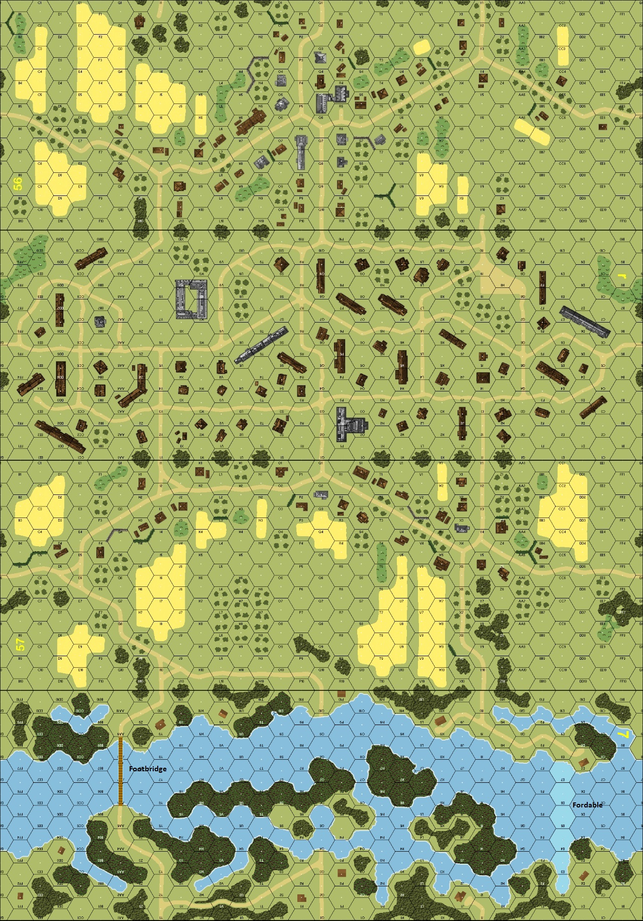 | Misc Rules: | River: Deep. Footbridge (B6.44), Fordable hexes (B21.41) |