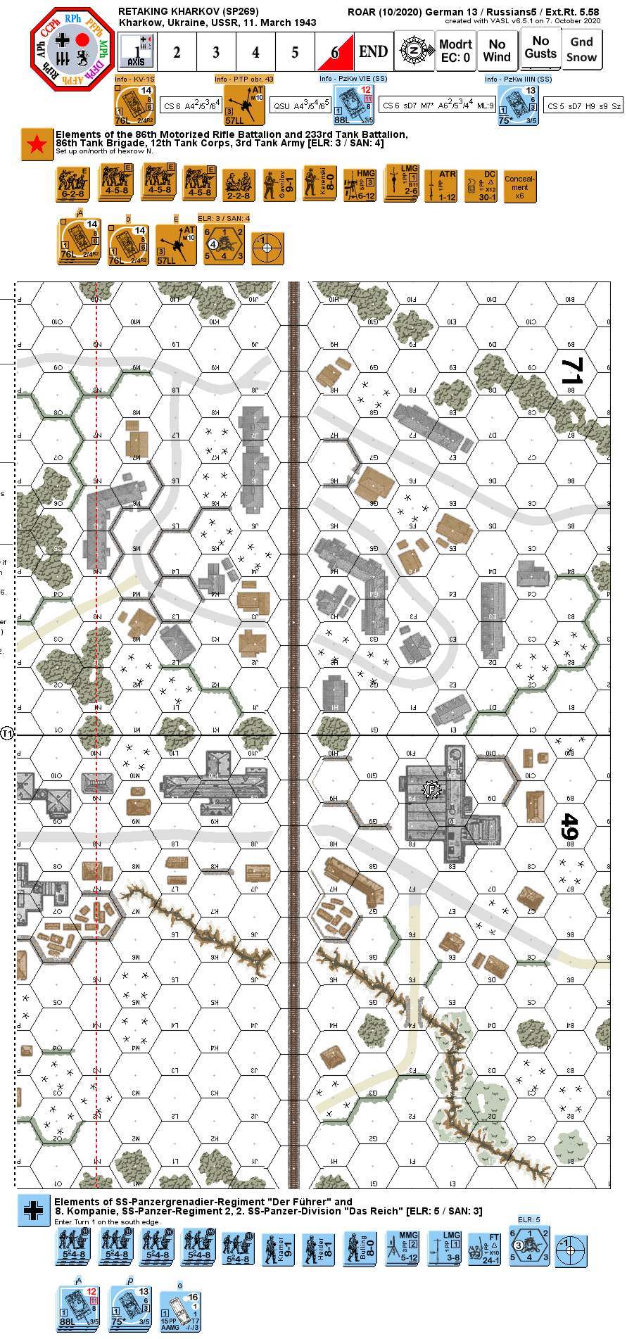 Tiger Is and panzer-grenadiers with a flamethrower from SS-Panzer Division 2 “Das Reich” attack to clear a railway station defended by 6-2-8s, a 57LL AT gun and KV-1S tanks from the 86th Tank Brigade.Attacker: German (SS) (Elements of SS-Panzergrenadier-Regiment "Der Fuhrer" and 8. Kompanie, SS-Panzer-Regiment 2, 2. SS-Panzer-Division 2 “Das Reich”)