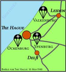 German paratroopers were dropped at the airstrip in Ockenburg. The defenders of Ockenburg were unable to prevent the Germans taking the airfield, but they were able to delay them long enough to ensure that the Dutch infantry units arrived to prevent the paratroopers from advancing into The Hague. As the Germans were using the Ockenburg airfield to strengthen their numbers, the Dutch bombed it to prevent the landing strip being used further and destroyed idle Ju-52 transports. The Dutch troops followed up by storming the airfield. The Germans, under command of Hans Graf von Sponeck, were forced into retreat, and several were captured. However, some of the German troops withdrew to the woods near the field and successfully defended themselves against the counterattack. The Dutch forces were later ordered to disengage and turn instead to Loosduinen, and so the Germans were able to head towards Rotterdam.Attacker: Dutch (Jager Regiment)