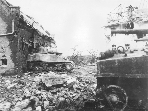 In the middle of September 1944, the Allied advance was grinding to a halt. The rapid advance east after the oollapse of the German froces at Falaise stretched the allied suply lines; the German forces on the western front were regaining their strength and were diggnig in along the Siegfried Line. Althuogh the Hürtgenwald had little strategic value for the allies, offensive operations were started in the middle of October, in part to keep as many German forces tied up to prevent them taking part in the defense of Aachen. After a month of heavy fighting the front line had barely moved forward, so on 2 November a new offensive was launched into the Hürtgen Forest, centered around the small town of Vossenack.Attacker: American (707th Tank Battalion)