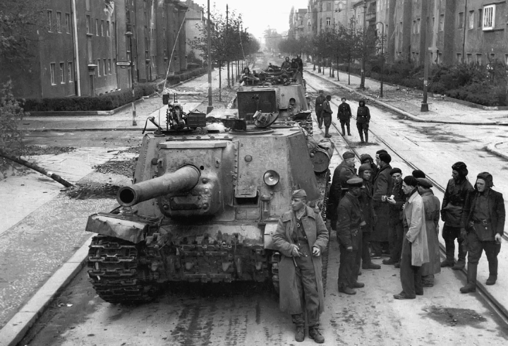 On January 14th, Rokossovskiy's 2nd Byelorussian Front attacked north and nortwest from the Narew bridgehead. The aim was to reach the debouch of Weischel and Danzig. On the 20th Stavka suddenly ordered Rokossovskiy to change the attack in a notheasterly direction into the center of East Prussia. On the right flank, the 3rd Guards Cavalry Corps advanced quickly and took Allenstein at 0300 in the morning of the 23rd. On the left flank, Volskii's 5th Guards Tank Army advanced towards the city of Elbing. Parts of the lead Tank Brigade headed into the city on January 23rd after being mistaken for German tanks. A violent and chaotic engagement arose in the streets of the old city. On the 28th the attack renewed.Attacker: Russian (5th Guards Tank Army)