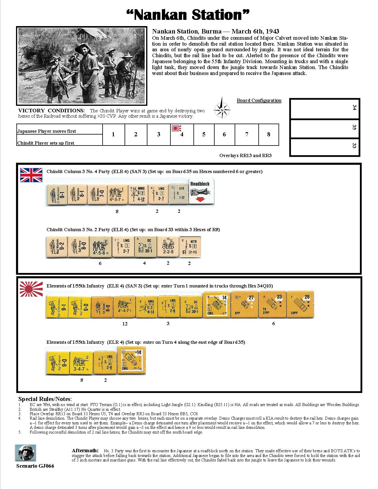 On March 6th, Chindits under the command of Major Calvert moved into Nankan Station in order to demolish the rail station located there. Nankan Station was situated in an area of nearly open ground surrounded by jungle. It was not ideal terrain for the Chindits, but the rail line had to be cut. Alerted to the presence of the Chindits were Japanese belonging to the 55th Infantry Division. Mounting in trucks and with a single light tank, they moved down the jungle track towards Nankan Station. The Chindits went about their business and prepared to receive the Japanese attack.Attacker: Japanese (55th Infantry Division)