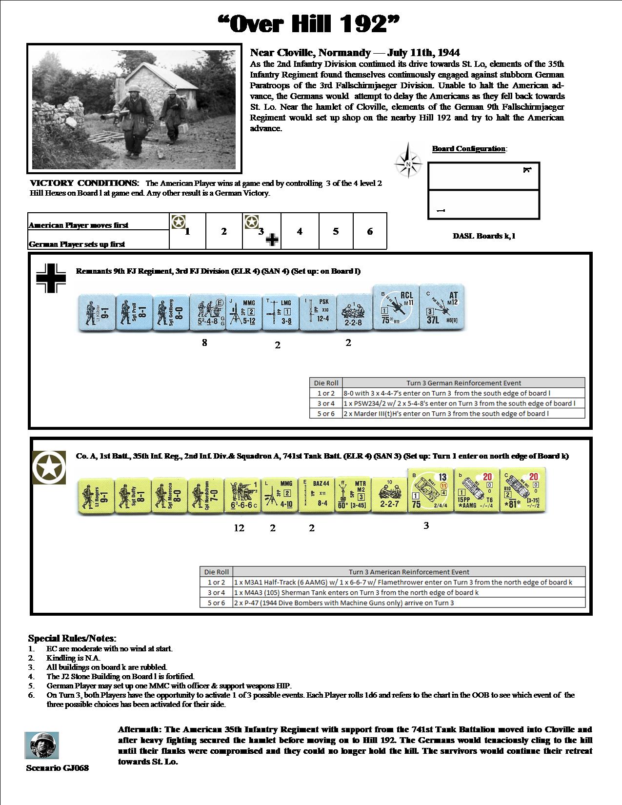 As the 2nd Infantry Division continued its drive towards St. Lo, elements of the 35th Infantry Regiment found themselves continuously engaged against stubborn German paratroops of the 3rd Fallschirmjaeger Division. Unable to halt the American advance, the Germans would attempt to delay the Americans as they fell back towards St. Lo. Near the hamlet of Cloville, elements of the 9th Fallschirmjaeger Regiment would set up shop on the nearby Hill 192 and try to halt the Americans.Attacker: American (Company A, 1st Battalion, 35th Infantry Regiment, 2nd Infantry Division and 741st Tank Battalion)