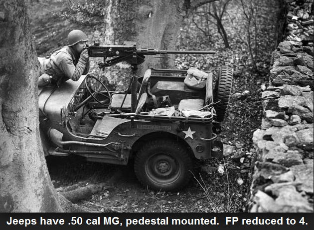 The old horse soldiers were the eyes and ears of the generals in older wars. They swept out in reconnaissance, probing far into enemy territory and reporting back. The 92nd Cavalry Reconnaissance Squadron performed these very same duties for the 12th Armored Division. Instead of horses, their steeds were Jeeps and armored cars. Speed and mobility were the chief weapons. Their primary duty was reconnaissance and observation. If at all possible, engagement with the enemy was avoided. However, at times, juicy targets of opportunity presented themselves that were too good to pass up.Attacker: American (Elements of D Troop, 92nd Cavalry Reconnaissance Squadron)