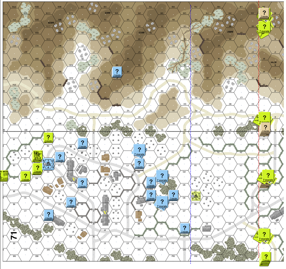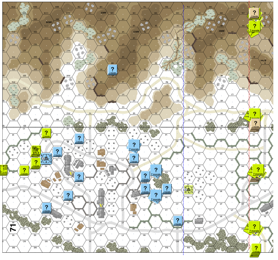 | 2023-02-26 | (A) X von Marwitz | vs | Michael Koch | American / Free French win | Set in December 1944, the Germans try to hold a village (a number of multi-hex buildings and a position on a hill) against a mixed force of Americans and Free French that attack the village from both sides with Ground Snow being in effect. The Germans have 10 squads, mainly 1st line, two Conscript and two 548s, three leaders, a number of MGs, a PSK, a StuG, and a Panther along with some fortifications. The Americans - coming from two sides, have a split force of 5 squad-equivalents, Leader, MMG, BAZ, 60mm MTR and of 2.5 squad-equivalents, Leader, MMG, BAZ. The Free French are actually the Légion Etrangère with 6x 458, two Leaders, 2x MMG, a BAZ, and a DC reinforced by a hefty 5x M4A2 Shermans, two of which have Gyros and for which are two Armor Leaders available. On the flank of the contested village, we find very high and steep hills (bd81) which makes for some interesting terrain. Note, that Vehicles can't cross double Crests unless along a road (of which there are none. EXC: Churchhill tanks - of which there are none either...) The high hills will eliminate many of the otherwise usual blind hexes. Brush is Vinyard and thus Bog Terrain. Game length is 5.5 Turns, so there's no time to be lost. In the West (=left) my plan was to use the MTR to pound the enemy units on the hill (victory location) and later put some WP cover for an eastward push into the village. For the beginning, I was not pushing to keep German units tied up in the west of the village. In the East (=right) of the village, I suspected the Panther the central forward woods (71P5) and the StuG a bit further north (71N1). With this assumption, entering a Sherman in the South would be an invitation of doom, so only one of the offboard tanks was poised to move down there in case the enemy would show his hand early revealing no threat down there. The French would have to push forward with strong Infantry elements through the woods by themselves. In the center, I would move one tank each to 81M1 and 81U1 where both would be safe from suspected enemy AFV and one of my Shermans would be able to pound the German position on the hill. The American infantry would support these tanks, hopefully be eventually capable of crossing the open ground covered by the Shermans and their smoke. Up north, I decided to set up three Shermans. The first one would make a run to 81S10, hopefully getting away with it, because I figured that the enemy StuG would probably have to turn CA in Woods to attempt a shot while the Panther would hold its fire to threaten towards the front. The second Sherman would move to 81O6 attempting HD. The third Sherman would either shift down offboard and then to 81M1 (in the unlikely case that the suspected Panther would turn out to be a Dummy) and otherwise take position in 81L9. The lone Halfsquad was to cautiously move towards the Victory Location of 81W5 after the Germans would be squashed by the Armor. The basic plan was to take out the German hill position as fast as possible, as it had a commanding view across the entire battlefield and could wreak havoc on my infantry almost anywhere unless in good TEM. Four Shermans from the East and the 60mm MTR from the West should see to that. I would hold the Victory Building in US Control in the West at game start, take the hill, the 71E7 building, and the 71N4 building for victory, while containing and ignoring the likely German "Alamo" of 71G3 and the rather inaccessible 71J5. In Turn 1, my initial moves worked as planned. The Sherman in 81O6 did not manage to go Hull Down but was not fired at which reinforced my hunch that the enemy StuG would be lurking in 71N1, avoiding a VCA change. The other two Sherman tanks took their assigned positions in the hills. The French infantry moved through the woods as planned, the Americans in the center as well, while I had the 347+BAZ move offboard to advance into 71W5 with the intention to "reinforce" vs. the suspected Panther. As I did not present any reasonable targets, the Germans could not do much. In Turn 2, I began pounding the German postion on the hill in earnest and I had good rolls including a CH by a Sherman vs. the Foxhole in 81V5. It turned out, that my opponent had posted no less than the German 9-1, 2x 467+MMG up there, which was stronger than I had suspected. Unfortunately for him, all of these broke quickly, which was a very serious setback for the Germans: There is no Rally terrain, and as the Allies are visible from three sides, hardly any place to go at all. For my attackers, this was very fortunate, since I did not have to resort to SMOKEing the hill position to allow for my infantry movement. The Panther moved out from where I had suspected him to take up position in 71N7 - a very powerful position vs. my southern Infantry push and just out of LOS from the tanks in the hills. In the West of the village, there was some little dancing around on both sides but no serious exchanges of fire. At this point, one of the "issues" with the scenario became apparent: The Germans can't do a lot - pressed from all sides, they can mostly only "opt" to stay in place to hold. By the end of Turn 3, the German hill position had been annihilated, with two Shermans dominating the hill from 81V5 and 81U6, now having LOS into the backs of the German positions in the village, which would mean that the Germans would have a hard time regaining Concealment after skulking. My lone HS on the hills had a safe approach towards the VC location. In the central bd71 woods, the Germans defended well, but I was able to reach the open ground next to those woods in force. My worst problem was the menacing Panther in 71N7 which held up my French Infantry all by himself. Luckily, I managed to put down WP in 71O8 next to him firing a Sherman from the hill. One other Sherman in 71O6 reeking of "Gyro&Armor Leader" was in Motion for a flanking threat of the Panther in 7