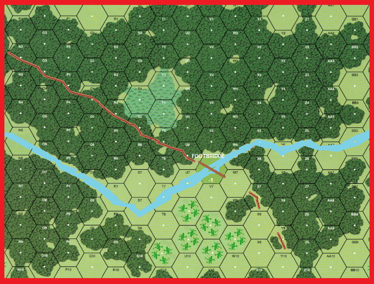 | Misc Rules: | PTO (8.0) , LJ, DJ, Interior hexes (8.2). Footbridge only crossing point. |
